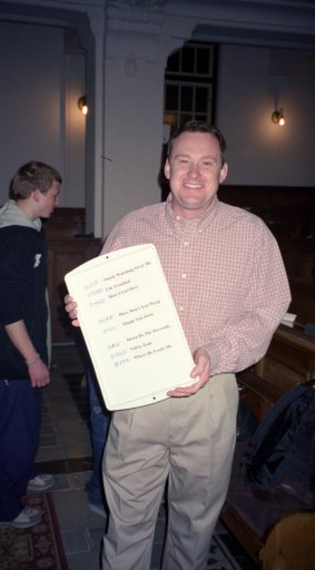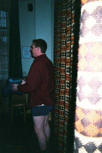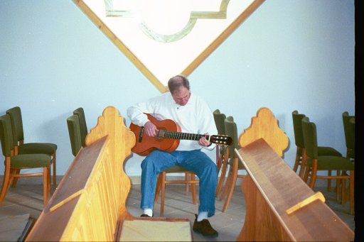 Before our first concert (Csurgó) John gets acquainted with the borrowed guitar he would be playing all week. |