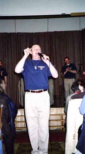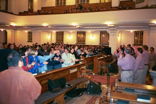Singing during the Kaposvár service. Note Zoltán (the priest) overseeing things from the pulpit. |
