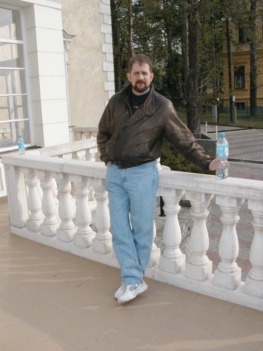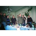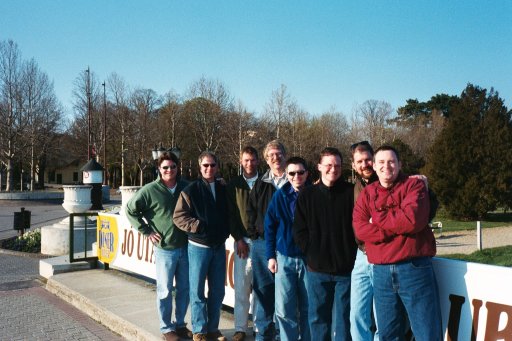 This group shot of us and our hosts was taken after the Tata concert. Front row, from left: Jim, Andris (interpreter), Ildi, Dani (tour guide and driver), Sanyi (driver and mascot), Rick, and Doug; second row: Michael, Chaz, John, Dan; and Greg on top. |