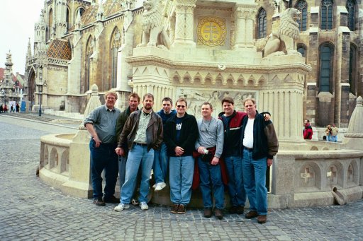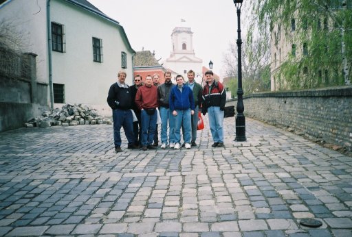 Here we are in a group shot, standing below the statue of Saint Stephen and the south end of his northbound horse (Budapest). |